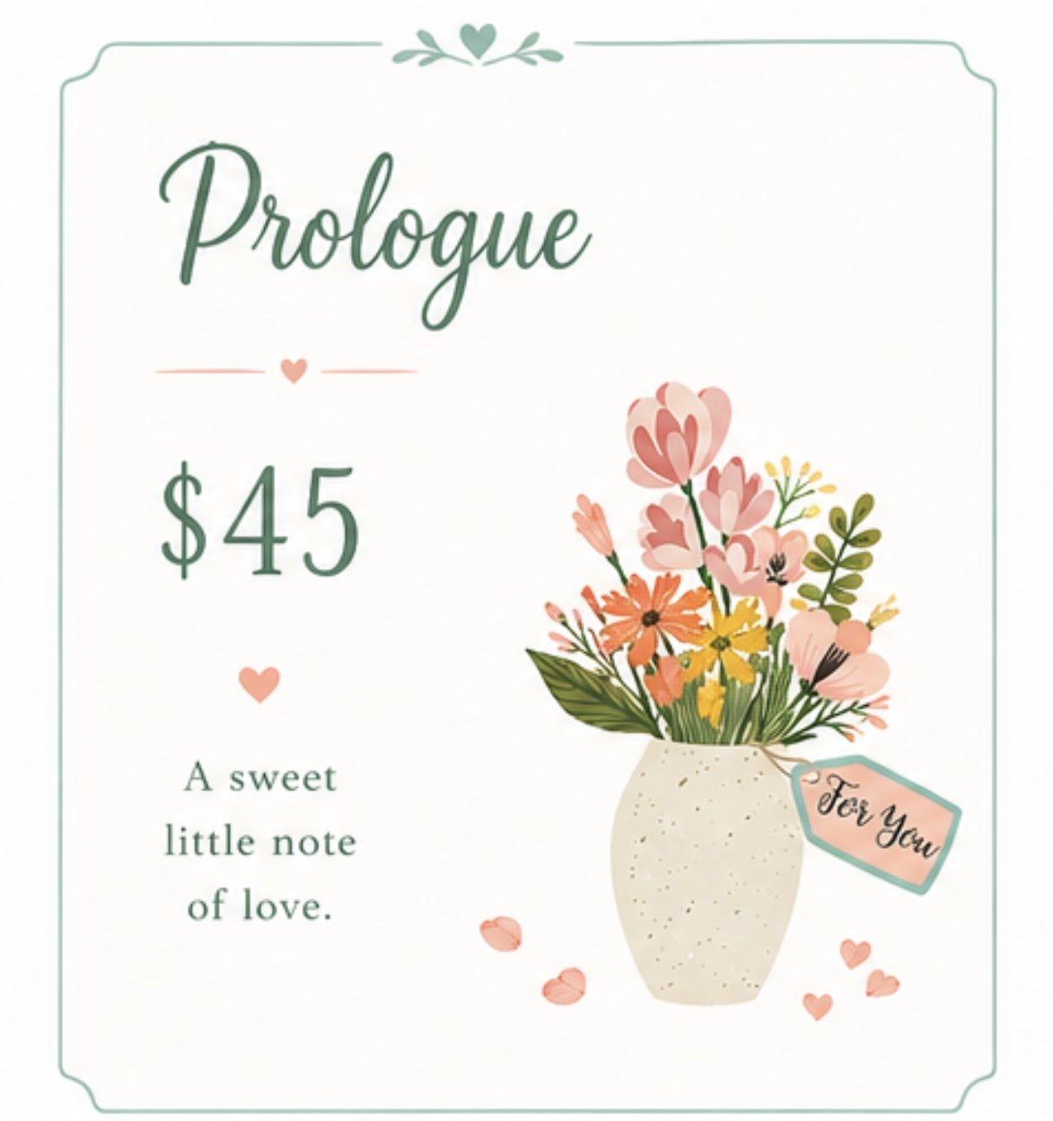 Shop › Prologue Floral Arrangement Image 1 of 2 Image 2 of 2 Prologue Floral Arrangement $45.00 Small florals designers choice small vase or mason jar Get notified by email when this product is in stock. Add To Cart Added! Small florals designers choice small vase or mason jar